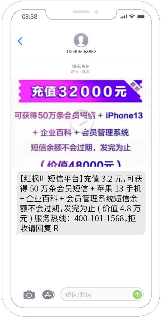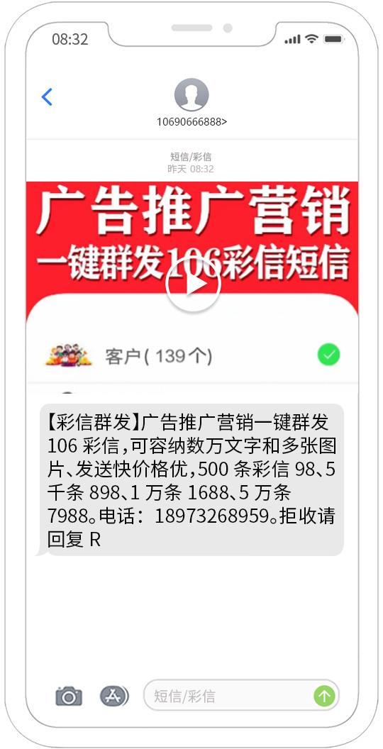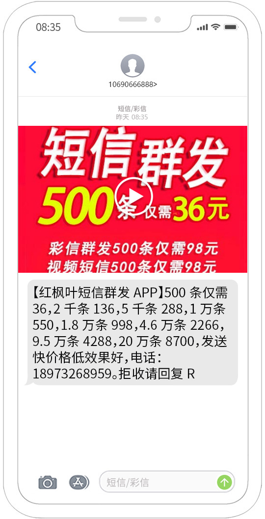 視頻短信發(fā)送能夠覆蓋移動(dòng)、聯(lián)通、電信用戶,正規(guī)集團(tuán)視頻短信通道,快速、可靠、穩(wěn)定、形象好,能快速將您的訊息投放到用戶的手機(jī)。